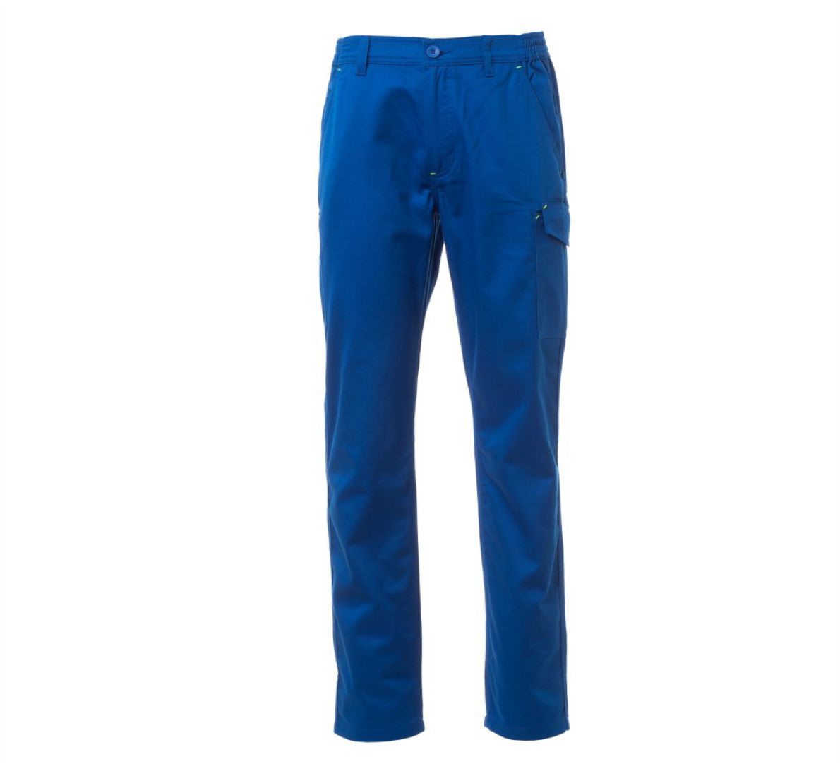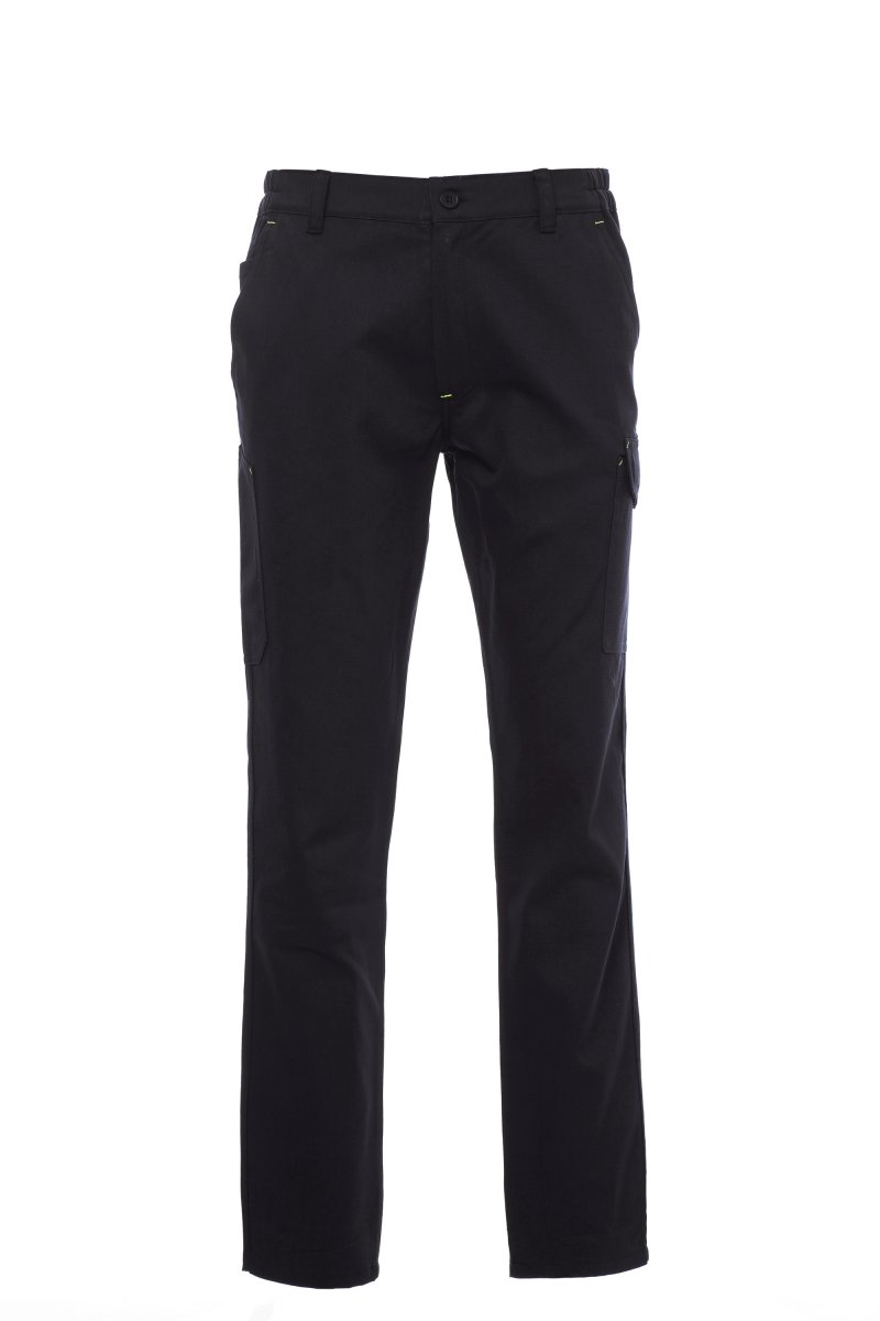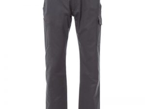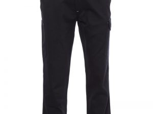 Hlače z zankami in elastiko v pasu, zapenjanje z zadrgo in gumbom. Dva sprednja klasična žepa, žepek za drobiž, žep za meter desno, ob levi strani žep z zapiranjem LOCK SYSTEM, dva žepa s poklopcem na ježka zadaj. Trojni šivi. MOŽEN DOTISK.