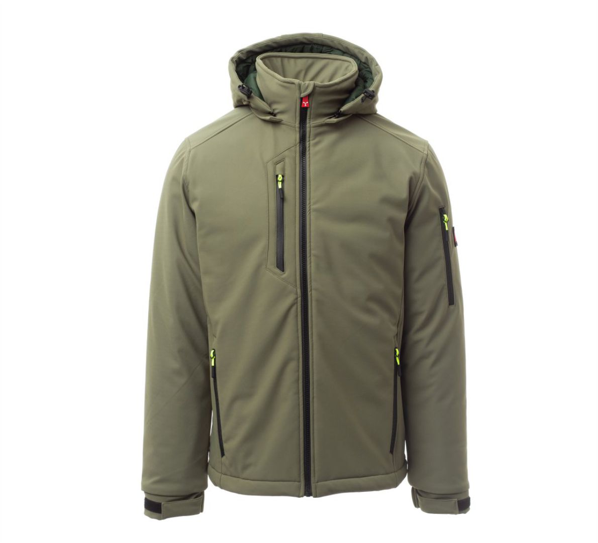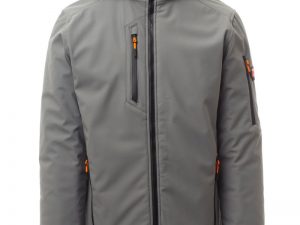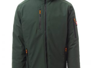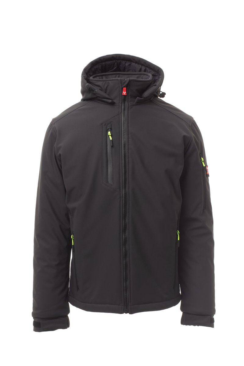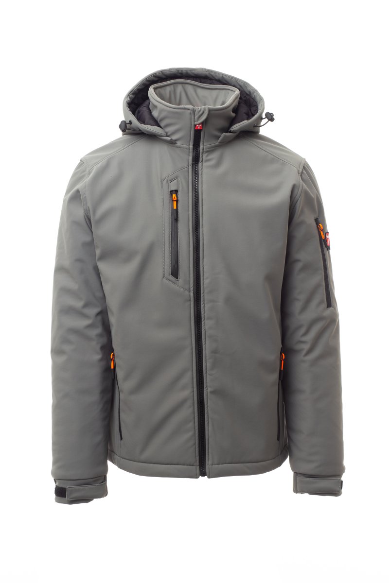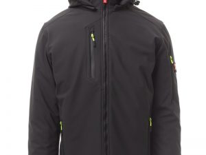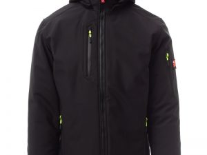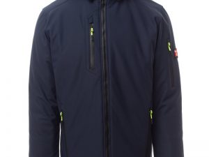 WP 8000 mm H₂O, WVT 5000 g/m² 24h. Moška 3-slojna soft-shell jakna s toplo podlogo (160 g/m²), ovratnikom z všivki iz flisa, zapiranjem z zadrgo SBS s kovinskim drsnikom in polavtomatskim zapiralnim mehanizmom ter personaliziranim jezičkom. Snemljiva kapuca z nastavljivo vrvico. Notranji ovratnik s stranskimi detajli iz flisa. Odsevni trakovi na zadnjem delu pasu in na zadnji strani kapuce. Elastične manšete na zapestjih, nastavljive z ježkom. Dva stranska žepa z zadrgo, en prsni žep s prevlečeno zadrgo in en žep na levem rokavu z integriranim držalom za pisalo in zapiranjem z zadrgo. Fluorescentni jezički zadrge. En notranji žep v obliki reže z zapiranjem na ježka. Nastavljiv spodnji rob s prilagojenimi zateznimi elastikami. MOŽEN DOTISK.